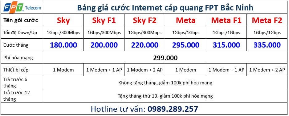 Hiện nay gói cước internet FPT Bắc Ninh đối với các khu vực có mức giá từ 180.000đ/tháng tốc độ lên đến 1024Mbps và nhiều lựa chọn khác tuỳ nhu cầu. Dưới đây là các báo giá được cập nhật báo giá chính xác như sau: