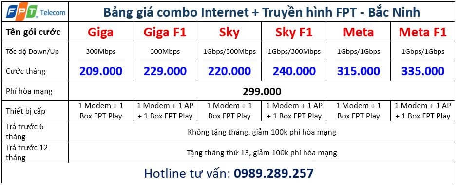 3. Bảng giá Combo Internet và Truyền hình FPT tại Bắc Ninh