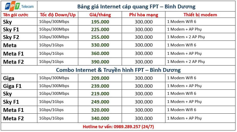 Hiện nay gói cước mạng internet FPT tại Bình Dương đối với các khu vực có mức giá từ 195.000 đồng/tháng tốc độ 1000Mbps và nhiều lựa chọn khác tốc độ tới 1Gbps tuỳ nhu cầu.