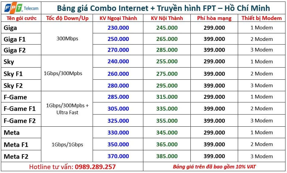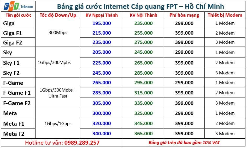 Hiện nay gói cước lắp mạng FPT Hồ Chí Minh đối với khu vực huyện có mức giá từ 190.000đ/tháng, tại Quận là 220.000đ/tháng tốc độ 300Mbps và nhiều lựa chọn khác tốc độ tới 1Gbps tuỳ nhu cầu. Dưới đây là các báo giá được cập nhật báo giá chính xác như sau: