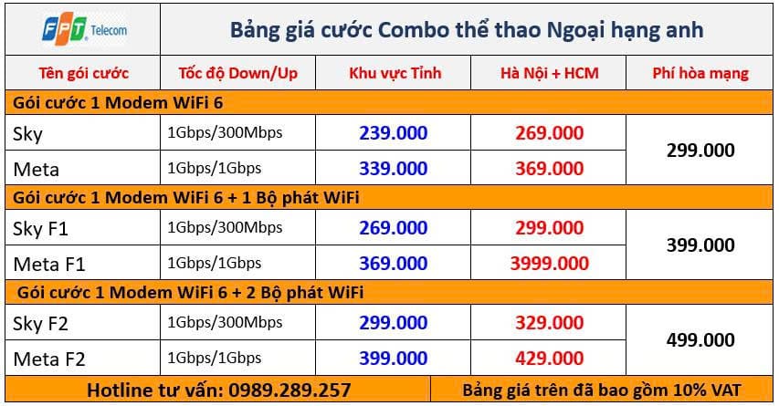 Bảng giá Combo Internet truyền hình Thể thao Ngoại hạng Anh